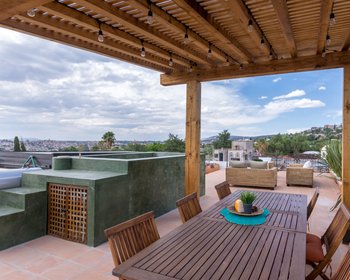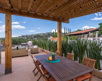 CASA GRANADA is a lovely, new home located in the Guadiana neighborhood just a few blocks away from the Rosewood Hotel and Parque Juarez. This is a beautiful house built with materials such as stone, copper, bronze, antique mezquite wood doors, and all combined with a contemporary design that includes large glass windows surrounded by quarry arches.