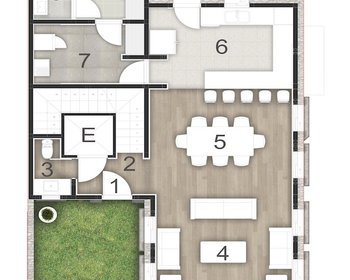 Residence 4 in La Noria is located right next to the mature laurel tree. With two exposed sides it is full of light and air. It features an entry courtyard which takes you to the front door. The ground floor features, living room, dining room and large kitchen, half bath, elevator, full laundry, staff quarters and back patio.