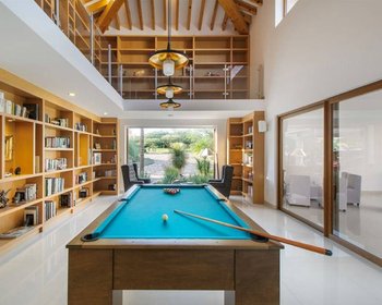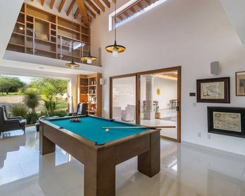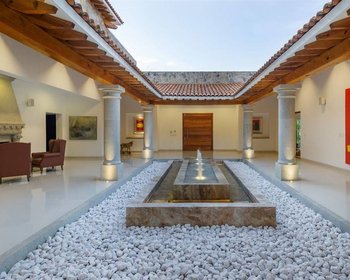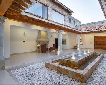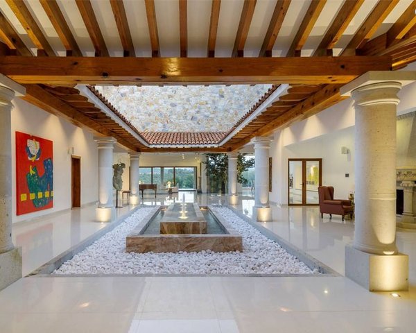 This beautiful residence is designed for demanding tastes, upon entering you will find a large rectangular fountain surrounded by white stones that welcomes you to a space full of tranquility. On the left you will find a large double-height library with access to a patio and garage that has space for 8 cars, on the right you will find the guest bedroom and the spectacular movie theater.