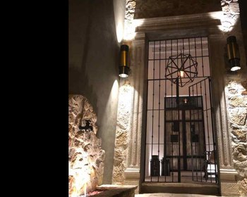 An artful, stone water fountain greets you as you approach the front door. The main entry has a large, iron, privacy gate and an oversized wooden, glass, and iron door to welcome guests. An enormous, carved, cantera entry table sets the tone for this home’s clever design. Traditional arches and modern, glass features, dazzle as you explore the bright hallways.