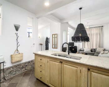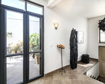 The masterfully designed front entry courtyard unites the main house and separate first-floor master casita suite. The casita is showered with natural sunlight and features high ceilings with wood beams, a kitchenette, mini split unit (ac/heater), private rooftop terrace and lush private patio. The spa like bathroom showcases handcrafted cantera sinks, a walk-in shower and private powder room tucked away out of sight.
