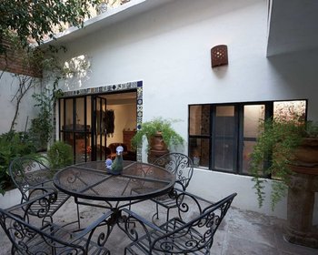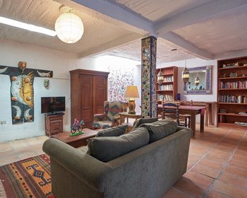 The home divided into three segments. The kitchen, living and dining room are all under one roof and configure around a private patio. The guest bedroom is immediate to the right of the entryway and shares a bathroom with the common areas. Another patio leads to an en-suite bedroom with an office nook. A staircase inside the master bedroom connects to a sizeable art studio. An exterior staircase leads to a rooftop with beautiful views of historic San Miguel.