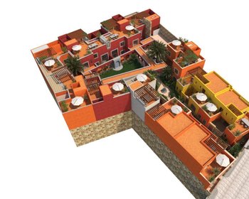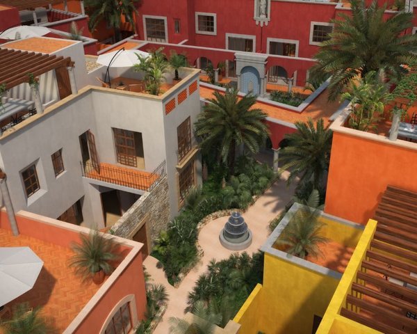 The Villas are located around colonial-style arches, forming two atriums with fountains that invite relaxation and contemplation and give the complex its name and character. The main atrium houses a garden in the center and the secondary atrium, a multipurpose area with lounge-type rooms, with bathrooms and kitchenette, and a terrace in front to be able to live with friends and family.