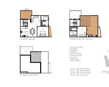 The set is made up of 12 independent villas that do not share any wall, each one is different from the other, they vary in finishes and size. All are designed with 2 levels and a roof garden or terraces, taking care of the visual relationship between rooftops and patios of the other villas, to maintain an optimal level of privacy between them.