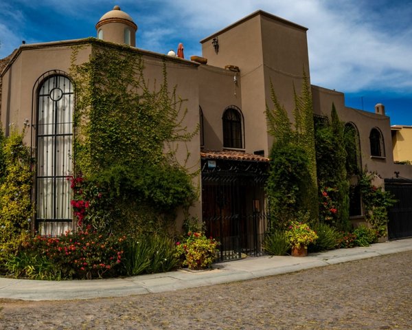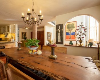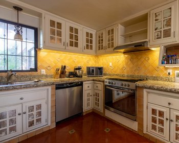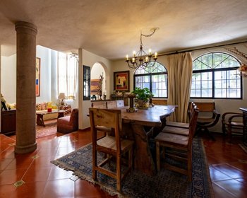 The attractive facade of the house is enhanced by beautifully cultivated landscaping and an elegant entrance. Inside, there is great light throughout, from the living room with its high boveda ceiling to the elegant dining room to the nicely appointed kitchen, which features granite countertops and a garden view. The 3 en suite bedrooms are generously sized with charming details such as a private balcony and walk-in closet, and the large home office/family room could be converted to a ground floor master if desired.
