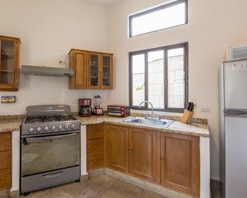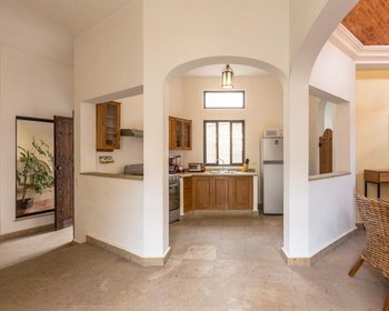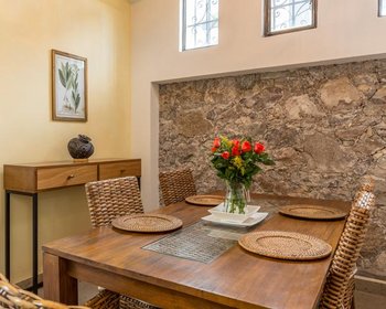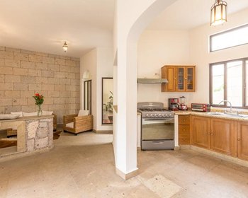 As you enter the house you will find a single car garage and a walk way that takes you to the main house, a two bedroom home that offers single level living and ample and comfortable spaces, lovely terrace with a water feature and open kitchen connected to the living and dinning room. The house has great finishes, thick rock walls, cantera floors, bóveda ceilings,polished cement and travertine marble.