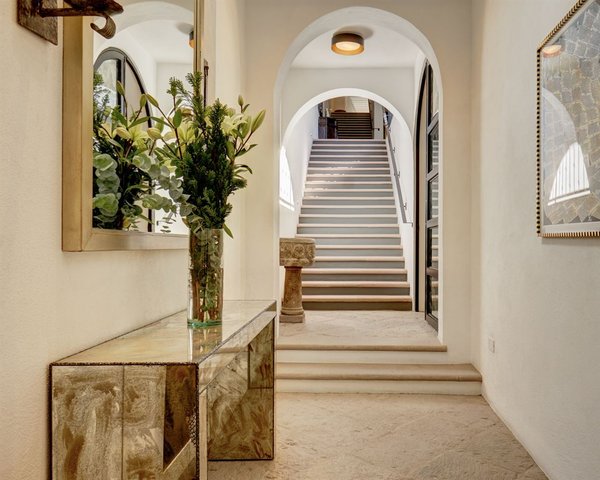 Upon entering at street level, a skylit staircase opens to the first level where large dramatic arched windows, doorways and high ceilings create an inviting indoor/outdoor space. This level has an al fresco sitting area, dining room, kitchen and outdoor dining terrace. This home is ideal for entertaining. The gourmet kitchen, with top quality appliances and luxury marble finishes is as beautiful as it is functional for large groups.