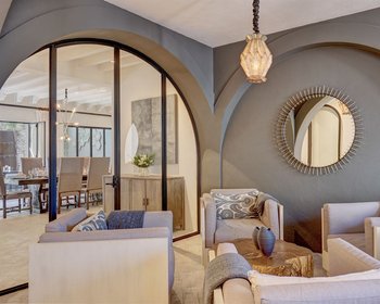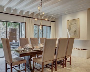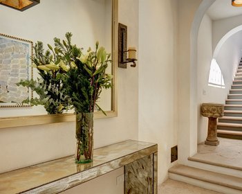 Open to the pool courtyard, a long, arched gallery leads to three of the four master bedrooms, all with luxurious en-suite baths, TV sitting area, coffee bar, wine cooler and air conditioners. Two of the bedrooms have fireplaces and one has French doors leading out to the pool courtyard.
