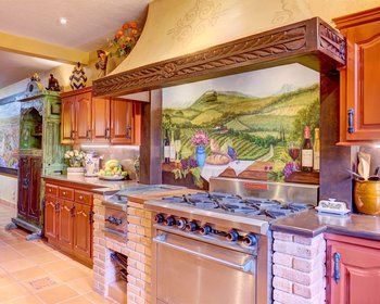 The large chef’s kitchen has been recently renovated with beautifully hand-crafted, carved cupboards, charming brickwork, a professional grade 6-burner stove and new appliances.