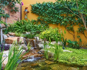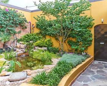 Located in the prime neighborhood of Atascadero, Casa Tejas is an impeccably maintained home with top-of-the-line artisanal cabinetry, stone and metal work. From the street, a door leads into a private, lushly landscaped courtyard with a charming pond. The intricately designed wrought iron front door opens into the foyer, with a custom designed chandelier. Beyond the foyer is the living/dining area and the kitchen. The architecture of this space is uniquely defined via arches and a set of stenciled pillars, which divide the dining area from the living room. The spacious living room has a cozy corner fireplace and leads to a light-filled office with large French doors that open out to a well-landscaped terrace.