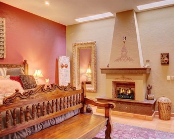 The master bedroom is on the first floor, adjacent to the living room. This large bedroom has a wall of custom-designed, wood cabinets and an exquisitely hand-stenciled, cantera stone fireplace. The large attached bath has soothing rose-hued cantera tile throughout, a large separate tub and a luxurious fireplace.