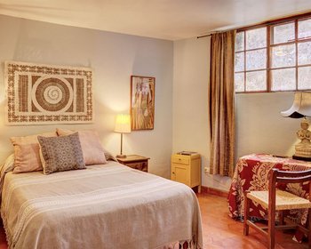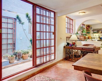 The first-floor apartment is a charming 1 bedroom and two-bathroom light-filled space. It includes a small patio, a large kitchen, and two additional living areas.