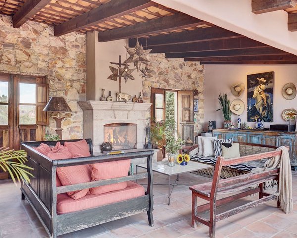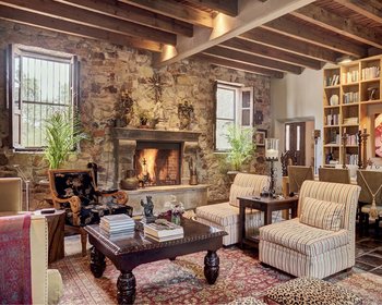 This designer home celebrates Mexican arts and culture, with traditional stone work throughout, rustically tiled floors and reclaimed antique mesquite doors and windows that bring a warm sense of history into a home with all the modern conveniences.