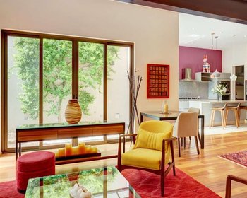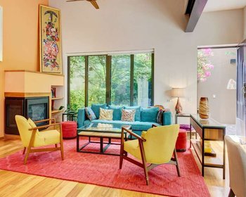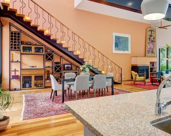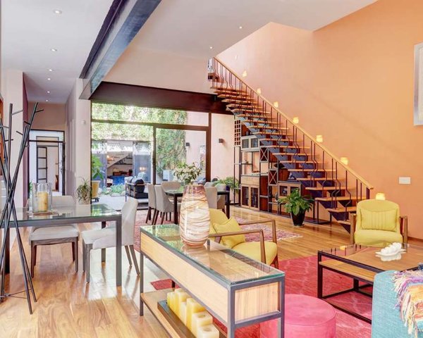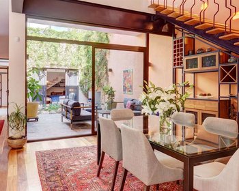 From the street, the front door opens onto a verdant green garden anchored by a dramatic flowering Tabachin tree (called a “Flamboyant” in English) and old growth climbing vines. This garden leads to the front house, which has a spacious open-plan downstairs. This airy, skylit room has 15-foot beamed ceilings and a dramatic suspended staircase along one wall. Sliding glass doors offer floor-to-ceiling views to both the front garden and interior courtyard, creating a seamless indoor-outdoor experience.