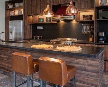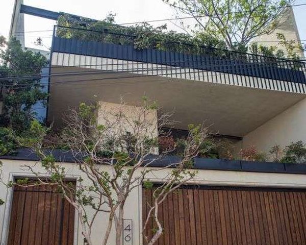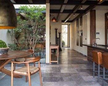 The front door opens into an outdoor entry, luxuriously pavedin cantera stone, leading to a staircase that takes you to a landing lit by tall minimalist windows. A soaring tree on this floor brings the inside out and grows to the next level. This floor contains two of three bedrooms.