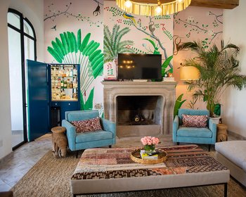 The living room is anchored by a showcase cantera fireplace on one wall, on which is painted a