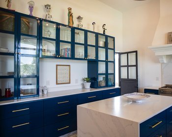 separates the living room from the kitchen, which sports chic blue lacquered cabinets and