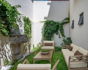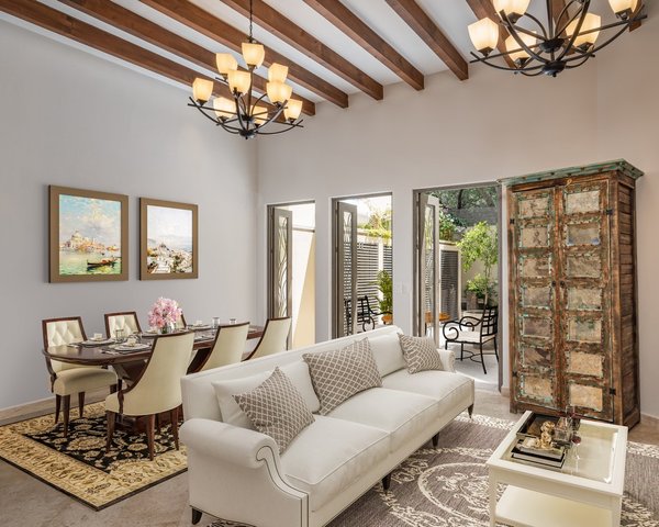 The master suite is indeed en suite with a walk-through closet and large private fountain-anchored courtyard, while the second bedroom—separated by dual pocket doors—was designed to function as a studio, office or media room but is the size of a bedroom. A full bathroom just outside the studio allows it to accommodate two guests—as a rental it can sleep four—and the side courtyard makes it extra cozy, flowing to the outdoors through dual French doors. Extra tall wood-beamed ceilings provide volume not found at this price point, multiple French doors throughout—six sets in all—welcome abundant light, and the overall attention to detail is exquisite!