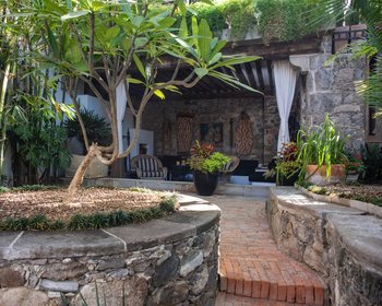 The courtyard is anchored around the original 18th century staircase, walls and colonial door surrounds. A few steps up and across the brick terrace is the Sala – a large open outdoor living room with one of Lacayo’s signature statements – an oversized wood-burning fireplace. This lovely room, with built-in seating, has rustic stone walls and hand-hewn beams. A recently renovated full-bath is adjacent.