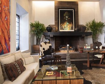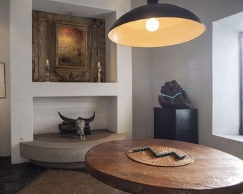 On the other side of the garden courtyard is the main living room. The room has the original 2- feet wide walls and 14-feet high ceilings. A second, elegant Lacayo wood-burning fireplace anchors one end of the room. The room is light-filled, with iron-framed glass French doors and windows that showcase the wide walls. The floors are traditional cantera stone with mesquite wood inlay. A terrazzo bar has been recently added and is an ideal addition for easy entertaining.