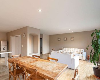 On the ground floor, bright living-dining room, with kitchen, laundry area and half bathroom