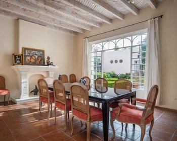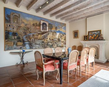 As designed by San Miguel’s well-known architect, Alan Wilkerson, the flow of front room, dining room and kitchen wrapping around the courtyard patio lined in floor-to-ceiling windows invite indoor and outdoor living, naturally arranged for large group entertaining or quiet mornings sipping coffee alone. The kitchen is a bright space topped in lovely blond granite and surrounded by hand-hewn cabinetry by master wood-worker Manual Padron. The main floor guest bedroom suite shares a bath and can also be visualized as office, studio or exercise space.