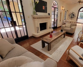 through arched glass doors. Living space flows directly into the Mexican style kitchen.