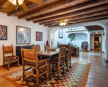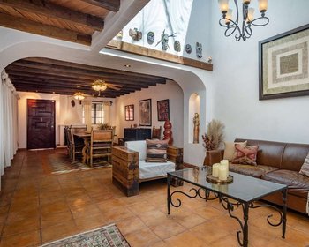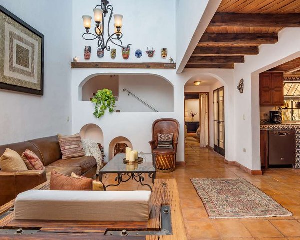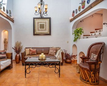 Stepping inside the home you are welcomed into a spacious room with an open floor plan accented with a fireplace and a traditionally built tejamanil and wood beamed ceiling. These surroundings immediately create a moment sitting with friends and enjoying each other’s company over lunch and a long weekend dinner. A vaulted ceiling full of day light adorns the comfy living room with wood and leather furniture accented by hand painted folk art cartoneria (paper-mache) masks, a tradition from Spanish Colonial days dating back to the 1600’s. The kitchen with a beautiful arched boveda ceiling, placed perfectly in its own space offers ample room for cooking at home for a few or many. With San Miguel de Allende’s perfect year-round weather, an internal garden and patio await you just off the kitchen for your morning breakfast rituals while surrounded with plants, mature vines and a traditionally hand carved cantera fountain. Completing the first floor is one of three large bedrooms, with a walk-in closet and its own fireplace that is surrounded by couches to relax any time during the day or night. The en-suite bathroom and shower is traditionally adored with white hand painted tiles and wood cabinets.