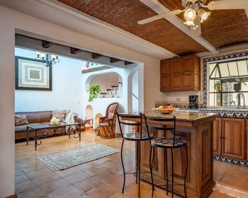 The second floor of the home also has a large bedroom, an en-suite bathroom, and a walk-in closet. The room also has its own fireplace and is embellished by a Juliet balcony offering light through traditional iron and glass doors. Enhancing the size of the bedroom is a large boveda brick ceiling, while the king size bed sits comfortably under a white alcove. The lights nestled in the corners of the boveda and end table lamps offer a cozy and soft romantic lighting at night. Stepping outside there is a large terraza surrounded by bougainvilleas and is the ideal location for an afternoon with friends and family over food and drink with ample seating, including a large padded cement bench, stretching the length of the terraza. A third bedroom or lock off casita is well-lit with its own Juliet balcony situated behind trees that also offer privacy. The large windows in the kitchenette and living room enlarge the room and offer plenty of light. In keeping with the style of the home, this area also has its own fireplace, bathroom and walk-in closet. This space can also be accessed separately from the home or through the garage.