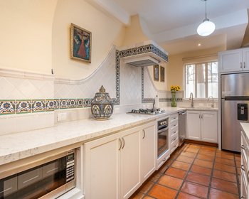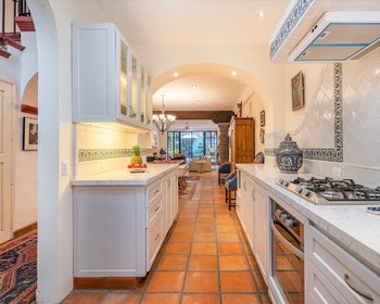 The great-room open floor plan boasts views all the way through to the back garden from the front door—a rarity in San Miguel—with an open marble-topped kitchen and cantera-carved columns spanned by a massive wood beam. Dual master suites on separate floors accompany a guest bedroom, office/library area, and a cozy media room. And a full bathroom on the roof terrace allows for day-long sunning and entertaining on the same level.