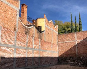 The high exterior walls are already in place. A foundation is already built which will save money in construction costs. A bathroom was left on the property for construction personnel.