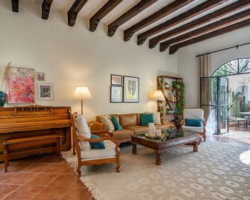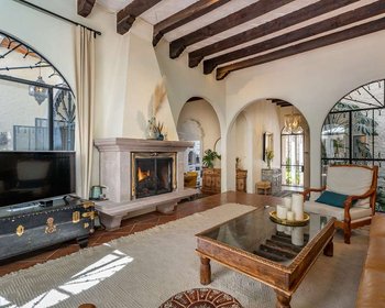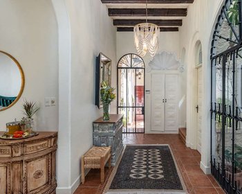 Entering the home, you step into a peaceful courtyard accentuated by soaring arches, lush greenery, and a carved stone planter. As you pass through the foyer with its jungle-like lightwell and fountain, you enter the open-concept living and dining areas, adorned with lofty ceilings with wood beams and carved details. Traditional arched iron and glass doors welcome you to the rear courtyard garden.