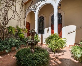 Surrounded by a tranquil fountain, bougainvilleas, flowering vines, and many other plants, the rear courtyard is a perfect spot for entertaining. The courtyard separates the main home in the front part of the property and the back half which houses two bedrooms each with en-suite bathrooms. One of these two rooms is currently being used as an artist’s studio and office space.