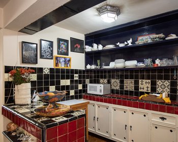 The cozy living room offers a fireplace, beautiful stonework, and large windows. The dining area also has a wall of windows which open onto a lovely shared patio with a grill. The welcoming kitchen features colorful traditional tiles and plenty of storage.