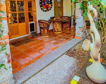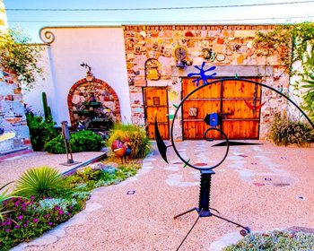 The house is a work of art, built on a double-lot, the large wooden doors open up to a beautiful large courtyard garden filled with lavender, fruit trees and abundance of greenery.Situated in Lindavista, a quiet upcoming area of San Miguel you will find a home unlike any other. Casa de la Vida, designed and built by the owner is one of the first in San Miguel to be considered planet-friendly and constructed from 50 percent of recycled materials, amazing Talavera china and beautiful different colors of mosaic from factories in Dolores Hidalgo and other parts of Mexico.