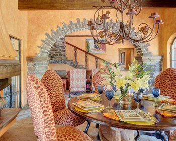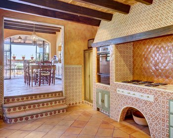 The large hacienda-style kitchen has a colorful breakfast room on one side while adjoining dining room on the other side. The kitchen also conveniently opens to the courtyard and the outdoor living areas.