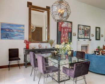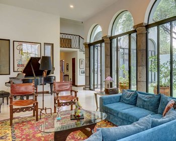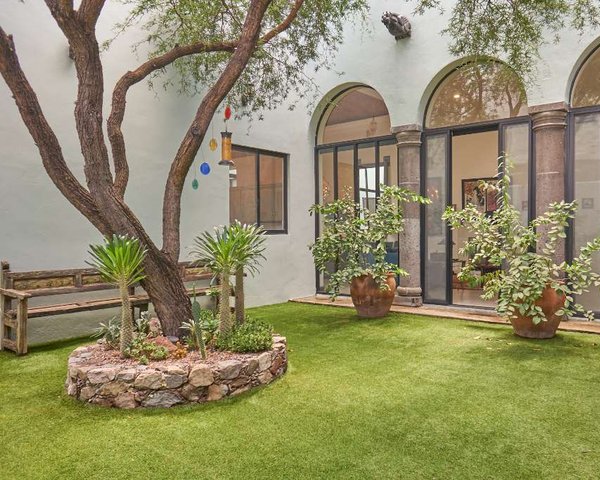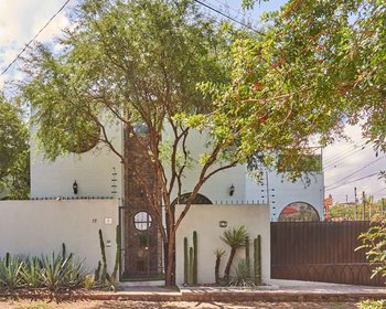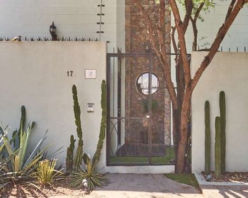 Welcome to Casa Galeria, a captivating modern home with a delightful blend of colonial touches, ideal for those seeking an architecturally-designed abode that encapsulates comfort, with a warm but sophisticated ambiance – all in one package. Throughout the house, the melding of modern architecture with colonial influences is artfully executed. Cantera columns grace the hall and stairs, with two brick bovedas on the main floor, infusing a touch of timeless elegance into a contemporary design. A third boveda leads to a balcony and second floor suite. These thoughtful details contribute to the inviting and special atmosphere of this exquisite home.Step inside and be immediately enthralled by the double-height ceiling that graces the living and dining room areas. Natural light floods in from arched windows to create a truly dramatic effect. In order to bring the outside “in”, three courtyards off this area incorporate plants native to Mexico.The layout of this lovely residence on the main level has been thoughtfully designed. It offers two guest bedrooms, a well-appointed granite kitchen with a built-in desk, modern appliances and ample pantry, and an inviting office space with an incorporated stained-glass panel. The office can easily be converted into an additional bedroom, adapting to your evolving needs. Each bedroom on the first floor has its own bathroom. The kitchen is bright and spacious, perfect for both culinary adventures and entertaining.Venture to the second floor, where you will discover the opulent main bedroom, an oasis of comfort and tranquility. The suite features a private sitting area with a double-sided romantic fireplace, an outdoor patio, a spacious walk-in closet and an ensuite bathroom complete with a double sink and a whirlpool bath/shower.Additionally, the second floor offers a dedicated workroom/artist studio, providing an ideal space for creative pursuits or professional endeavors. One of the most enchanting aspects of this remarkable home is the rooftop terrace, perched atop the double-height living room area. This private haven offers sweeping views of the surrounding landscape, setting the stage for relaxation and outdoor gatherings. Imagine savoring your morning coffee, hosting intimate soirees against a backdrop of wonderful sunsets in front of a gas fire-pit, or having guests over for a barbecue utilizing a built-in chef-quality grill.This extraordinary residence transcends mere functionality and comfort; it exudes a laid-back vibe that effortlessly harmonizes with its surroundings. With its soaring ceilings, well-appointed living spaces, captivating rooftop terrace, and abundant natural light, this home offers a unique, stylish living experience.