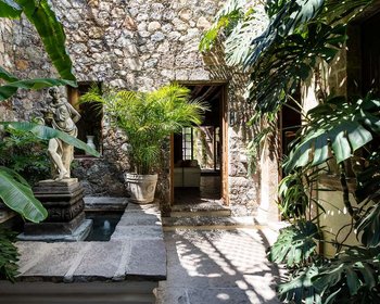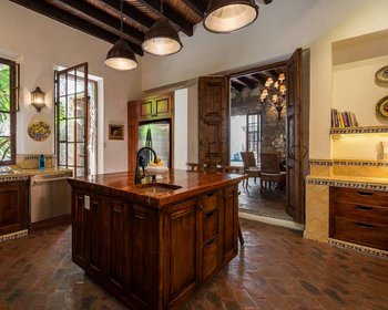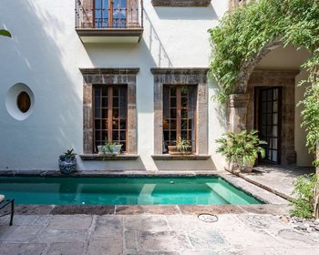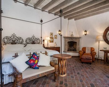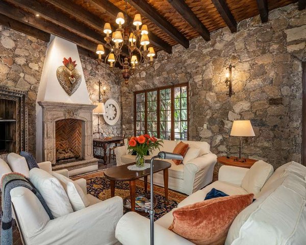 While it looks like it’s been here for years it was built around 15 years again and designed by the well known and respected San Miguel architect Alan Wilkerson. The charming entry courtyard sets the mood of anticipation when you walk into a large living and dining area overlooking the pool and outdoor entertainment center. A well portioned kitchen with generous mesquite counter island, offering plenty of space for your favorite cooks and audience. Off the kitchen is a rare find in Centro; a one car plus garage, laundry area and bathroom. The spacious area could easily have an added pantry if desired. Once leaving the living area by the pool find a conveniently located and enchanting powder room with carved Cantera sink. A seating area then leads to a main floor very spacious primary bedroom suite with carved Cantera stone fireplace, desk and seating area, generous colonial tiled bathroom and very large walk-in closet. Up a wide set handsome staircase to another primary bedroom ensuite, the same gracious space as below and the same amenities. The hallway to the other two guest bedrooms features a barrel boveda ceiling and another outdoor entertainment area with fireplace. Finally up the staircase to a protected outdoor seating area featuring a half bathroom, bar and sink setup to make your entertaining easy. Walk across the terrazza to view the Parroquia and street side seating area.