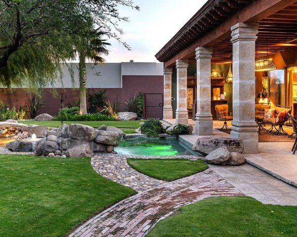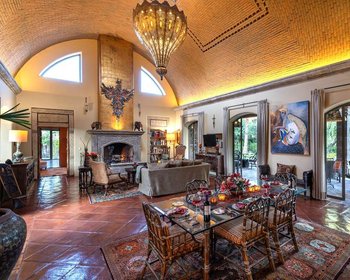 San Miguel de Allende boasts a plethora of Spanish Colonial mansions, but seldom does one find a single-level-living home with such international appeal as Casa de Salca! While the base architecture is Spanish Colonial in style—carved cantera stone fireplaces, columns and window surrounds, terra cotta floors, wood beams—the home is accented throughout with architectural relics from India, Morocco and Indonesia. The antique front doors, for example, feature a stylized Ganesha centered above the lintel. While sporting old-world architecture and accents, this three-year-old home offers the most current in design finishes—solid-surface countertops everywhere—and technological amenities, from the whole-house filtration and water softener to irrigation, intercom and security systems. Visitors pass through a boveda-vaulted Moroccan-style foyer before passing through a fountain-anchored central courtyard and finally arriving in the massive canyon-vaulted boveda Great Room with triple-height volume, 7-foot-high custom cantera fireplace and numerous French doors maximizing the indoor-outdoor lifestyle so valued here in San Miguel. The rear covered veranda sports an antique wooden bar and bar armoire, dining and seating areas with another massive cantera fireplace, all opening to the Tim-Watcher designed gardens and stone-lined hot tub. Two additional en suite guest bedrooms front the house for maximum privacy, with the beamed-ceiling master suite—boasting a massive cantera fireplace, terrace, and separate office—at the rear of the home facing the gardens. The master bath and massive walk-in closet are likely the most impressive you will have seen in any home at triple the value—the closet alone is bedroom-sized, the bathroom large enough to host spa parties with dual massage tables! Casa de Salca sits within the gated community of Candelaria a short drive north of San Miguel, the home sits at the end of a cul-de-sac for maximum privacy, minimum traffic. The south-facing massive gardens look over a protected land preserve, ensuring permanent privacy and green space behind the home. And as a new home, Casa de Salca offers all the expected technical amenities mentioned above, housed within an oversized two-car garage with additional storage. Come tour this home with me in slip-off loafers, you’ll want to sink your toes into the lawn as you wander about, sangria in hand, envisioning your new life in this paradise!