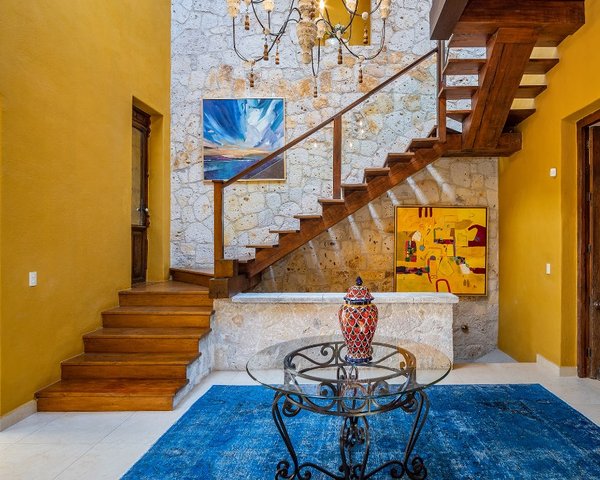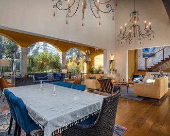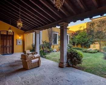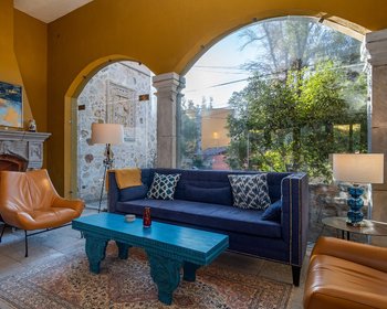 Surrounded by mature trees on this quiet street that leads to the Botanical Gardens, this elegant and modern home has Spanish colonial accents including hand carved Cantera fireplaces and architectural antique doors.Perfect for entertaining, the entry hall opens to two spacious living rooms and a dining area with soaring 2 story ceilings framed with rustic white stone walls. An expansive glass wall is cut and fitted to the stone allowing integrated indoor and outdoor space while a Cantera fireplace provides warmth and soft light at night. The kitchen has glass tile and all the modern appliances surround by warm dark wood custom cabinetry.The cozy mirrored breakfast area opens to the portal with bifold windows for passthrough service for entertaining friends and family. With 4 stunning bedroom and bathroom suites, the only challenge will be how to say no when friends or family want to visit.The living rooms have a wall of custom folding French doors that open the indoor space to the sunbathed portals and the sound of birds visiting the fountain. The private gardens are lined with comfortable benches under the portals with a large BBQ area with sink and a pizza oven “nicho”.The more formal portal has room for large gatherings to dine and enjoy the pleasant San Miguel weather.The walls, floors and ceilings of this architect designed home are a rich blend of stone, plaster, warm colors, wood and glass. A hidden bonus is the enormous stone lined basement with Cantera fireplace.Need a kid’s playroom or a place for teens to chill? What about billiards or a wine cellar? The possibilities are unlimited!This home will lift your spirits and let your imagination soar.Change your life with this amazing home!! Built In: 2017 Parking: Off Street Garage: covered, electric Cable Internet Security System High Speed Internet Fruit Trees Covered Terrace Patio Air Conditioning