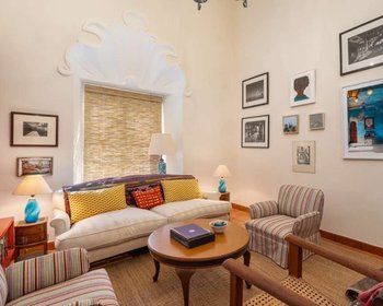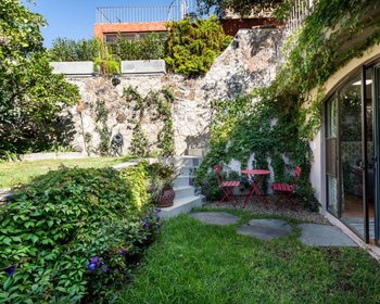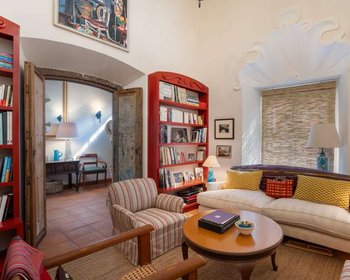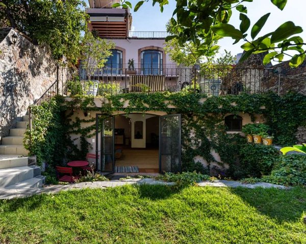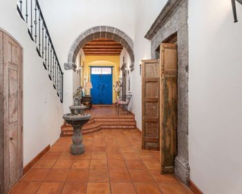 Located on a lovely cobblestone street in Historic Centro is Casa Adele, a three bedroom, three and a half bathroom lovely Mexican colonial style home. Directly across the narrow street is the Capilla de Calvario built in 1753. Entering the home you will find a den area to the left, perfect for reading or relaxing. The open concept living room and dining room area with a fireplace serving both areas is spacious and light-filled. The beautifully tiled kitchen is reminiscent of one that can be found in an old hacienda. A half bathroom completes the interior of this level. Just outside of the living room and dining room area a large terrace with fountain is ideal for enjoying al fresco dining. A verdant and beautifully landscaped garden is located just below the terrace flanking the third bedroom/casita on the lower level. The casita has its own bathroom and kitchenette for your guests or renters to enjoy. The primary bedroom and guest bedroom each with en suite bathrooms, closet spaces and balconies overlooking the terrace and gardens are located on the second level. A large office space with ample storage can also be found on this floor. The stairs to the rooftop which are located in the office lead to the rooftop terrace where the laundry room is located. Breathtaking panoramic views of the churches, Centro, city and mountains can be enjoyed from the rooftop. A half bathroom and loggia is perfect for entertaining in this area. Two deeded parking spaces for this home are located in the Santo Domingo gated development—a very rare commodity in Centro! Casa Adela is offered furnished with exclusions.