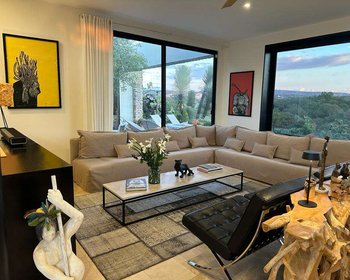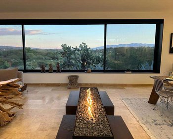 Welcome to San Miguel's vineyard living at its finest in beautiful Valle de los Senderos just 5 minutes from Centro but a world away with its tranquility and lifestyle that it has to offer. Los Senderos hosts 3 restaurants, biking and hiking paths, equestrian stables, spa and hot springs swimming facilities all at your disposal. Driving through the vineyard you will find a newly constructed Mexican, Modern, Minimalistic one level house with simple clean lines designed by Mexican Architect Luis Sánchez Renero, with the finely crafted details of a contemporary villa. This exceptional home is situated on a stretch of land with a south/east exposure with large windows which offer unobstructed views to San Miguel and a gently flowing green space buffer of mesquite trees, majestic nopal cactus and pathways. A natural river rock stone wall blends the house into the environment and only reveals its contemporary character from the entry side and once you step inside. The beautiful green space below is protected within the Los Senderos masterplan as an ecological reserve, so nothing can be built to take away the views. The mature and almost zero scape gardens were designed by Timoteo Wachter and enhance the natural beauty of the natural landscape and the villa. Opening the large entry door unveils this "one floor living" home. The travertine floors showcase the warm earth tones throughout the house. Lights can be controlled by phone, the entire house is hard wired with Ethernet. The ultra modern European style kitchen with self closing drawers is top of the line with built in modern appliances, including an espresso/coffee maker and an induction cooktop. The open floor plan takes advantage of the beautiful views and leads at one end to the master bedroom and master bath and on the other end to 2 bedrooms/offices and a full bath. Build in floor to ceiling cabinets allow for ample storage including a walk-in closet attached to the master bedroom. A 100 year old olive tree in the courtyard and the attached deck with an open fireplace pit invite you to have your breakfast or relax for sunsets. The soft cream plastered walls flow inside the large open space living room and dining room. The home comes with new a gas generator and 2 voltage regulators, Starlink for ultra fast and stable internet and a mesh wifi system. The kitchen features a pantry and a reverse osmosis water filtration and is connected to a state of the art whole-house filtration system and water softener system that doesn’t use salt. Solar panels on the roof and two efficient Bosch water heaters make sure that you will feel warm in the colder months. Casa Agave has a large garage with built in storage, a spacious laundry room and extra storage rooms. Complete with a glass enclosed yoga studio on the roof with gorgeous views over Valle de los Senderos. Casa Agave is partially furnished and all additional furniture is for sale.