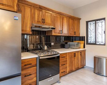 • Kitchen: Parota wood cabinetry, white granite countertops, black tile backsplash, and a modern island with built-in appliances.