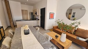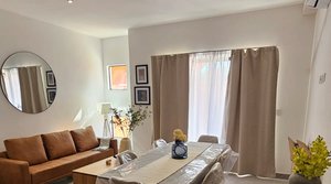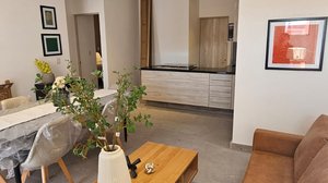 The apartment has a contemporary style. It has 2 rooms one with queen bed and the other with 2 single beds , it has a terrace with garden space. Evething on the apartment is brandnew.