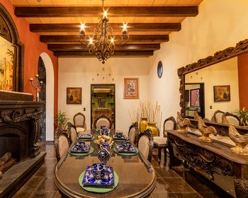 The home is filled with character, boasting cantera stone floors, wooden beam ceilings, and textured stone walls that add warmth and timeless charm. Whether you're gathered for dinner in the elegant dining room beside the gas fireplace, or sharing breakfast in the sunny patio by the stone fountain, the home fosters connection and comfort at every turn.