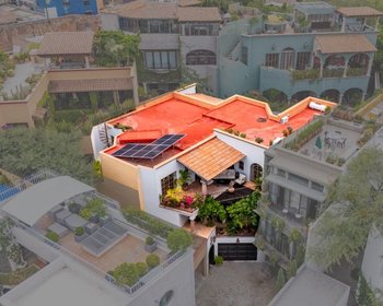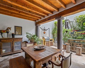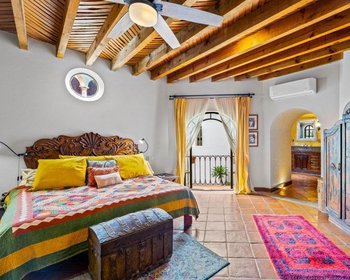 Welcome to Rincón Colonial San Antonio, a hidden gem tucked away in one of San Miguel de Allende’s most charming neighborhoods. This residence beautifully combines the timeless elegance of colonial architecture with modern comforts for effortless living. At the end of a peaceful street, behind an unassuming door, awaits this beautiful secret retreat that offers exceptional privacy. The first entry is an electric gate that doubles as a garage door, leading to an additional secure garage door for added convenience. As you pass through the main entrance, you’re greeted by classic stone walls, charming niches, and a brick bóveda ceiling that guide you to the first level of this enchanting home. On this main level, you’ll find one of three spacious principal bedrooms, each with an en-suite bathroom, dual sinks, and generous walk-in closets. The gourmet kitchen has been tastefully remodeled with a new oven, range, dishwasher, wine fridge, and a huge walk-in pantry—perfect for preparing meals and entertaining loved ones. A cozy living room with a cantera fireplace invites you to relax while listening to the gentle sound of the courtyard fountain. Just outside, enjoy an inviting sitting area surrounded by fruit trees, a built-in grill, and an outdoor dining space ideal for sunny afternoons. A spacious laundry room completes this level for your convenience. For music lovers, built-in audio speakers on both floors set the mood for every occasion. High beamed ceilings, five inviting fireplaces, six ceiling fans, and three AC splits ensure year-round comfort throughout the entire home. Before heading upstairs, pick a favorite bottle from your climate-controlled wine closet. As you ascend, natural light bathes the staircase, leading you to an open foyer and the second terrace—perfect for sipping wine while taking in breathtaking views of the Parroquia. On this level, you’ll find the other two principal bedrooms, each with its own bathroom and ample closets. These two rooms share a private terrace where you can unwind with a good book. A bright studio provides a quiet space to work or paint, while the second living area offers endless possibilities—use it as a library, music room, or TV lounge to suit your lifestyle. Additional highlights include a full solar system, UV and reverse osmosis water purification, a high-pressure water system, and an exterior freshly painted in 2024. The property is also permitted for a future rooftop terrace, adding even more potential to this exceptional residence. Rincón Colonial San Antonio is more than a house—it’s a warm and soulful sanctuary, rich in character, history, and charm, ready to welcome you home.