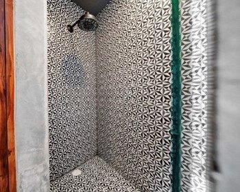 Inside, the thoughtful design is where modern aesthetics meet rustic charm. The rear bedroom offers a peaceful sanctuary, crowned with a classic vaulted ceiling and fitted with a luxurious king-size bed. The bathroom is a showcase of high-end finishes, with a walk-in shower, ample closet space, and a skylight that invites natural light to cascade in, transforming daily routines into moments of indulgence.