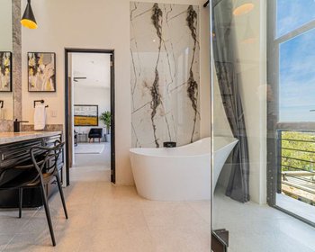 Inside, the home’s interiors are equally impressive. The main kitchen, equipped with top-of-the-line appliances, opens to the garden, blending indoor and outdoor living. The spacious living room, with its double-height ceilings, gas fireplace, and expansive iron-framed doors, provides an inviting yet sophisticated atmosphere. The master suite, located on the upper level, redefines luxury with its private balcony, lavish bathroom, and expansive walk-in closet. Each of the six bedrooms offers unique features, including private terraces, en-suite bathrooms, and breathtaking views.