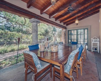 A Serene Escape Near San Miguel de Allende Tucked into a tranquil corner of one of San Miguel de Allende’s most desirable gated communities, this architectural jewel—masterfully designed by Gabor Godet—effortlessly blends sophistication with serene country charm. Set beside a quiet lake and bordered by lush green space, the property offers rare privacy and uninterrupted views of nature’s artistry.The main residence features three beautifully appointed bedrooms and three-and-a-half baths, while a separate one-bedroom, one-bath casita adds privacy and flexibility for guests. A graceful trellis-draped carport provides covered parking for two vehicles, wrapped in flowering vines that set the tone for the elegance within.Step inside to soaring double-height ceilings and a grand stone fireplace that anchors the sunlit living room. French doors lead to expansive outdoor living areas, including a generous covered veranda equipped with a grill, sink, refrigerator, and bar—tailor-made for al fresco dinners and spirited family gatherings. Beyond, a sparkling dipping pool is cradled by mature trees, creating a park-like sanctuary that invites lingering afternoons.Inside, the interiors exude thoughtful luxury: custom furnishings designed specifically for each space, artisan cabinetry, granite countertops, and top-tier GE Profile appliances. Rich textures—from cantera and Saltillo tile floors to hand-hewn wood-beamed ceilings—create a warm, welcoming ambiance, while perfectly placed windows frame ever-changing vignettes of the surrounding landscape.Residents of this exclusive enclave enjoy 24/7 security, a beautifully designed clubhouse with swimming pool, gym, tennis court, grotto, and panoramic rooftop terraces that offer sweeping views of the mountains and the shimmering presa below.Just a short drive from the cultural riches of San Miguel de Allende—a UNESCO World Heritage site renowned for its vibrant arts scene and colonial charm—this is more than a home; it’s a lifestyle of quiet elegance, crafted for those who appreciate beauty in every detail.