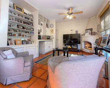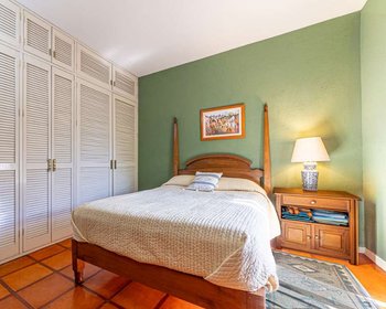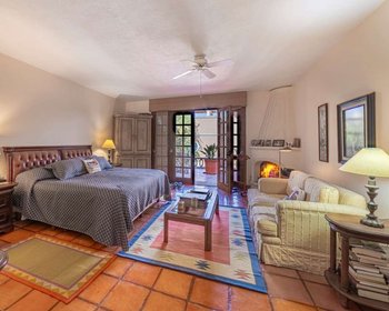 From the main living area, you’ll find access to a covered terrace, an ideal spot for al fresco dining while enjoying the soothing sound of the courtyard fountain. The Saltillo tile flooring, treated with premium sealers, enhances the home’s traditional Mexican aesthetic, while the patio’s thoughtfully designed concrete blocks with gravel accents add a unique visual appeal.